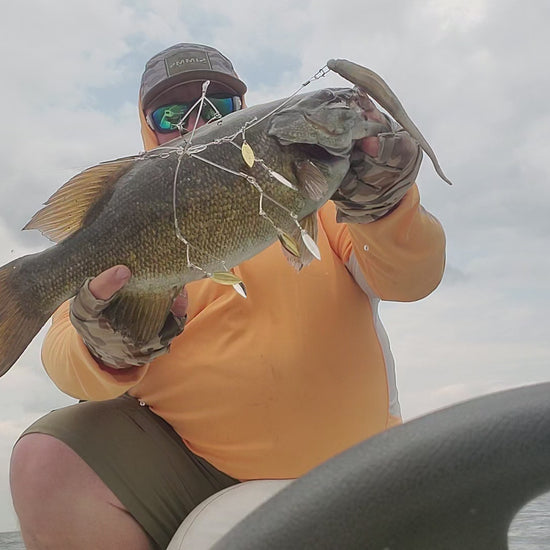 As with the original QUAD HOVER, our proprietary "Hub and Spoke Armature" floats freely on a frame of 150lb Seaguar Blue Label Flourocarbon Leader material. Unrigged, straight out of the package, HOVER X weighs in at 17 grams (just over 1/2 oz) with #3 premium willow leaf blades , uniquely hung in tandem to each arm and center wire using our handmade clevis-style swivels, a premium 80lb VMC barrel swivel and a 65lb VMC DuoLock snap. HOVER X is tough as nails. Musky guys (or gals, or whomever).. just upgrade that snap if you want to daisy chain your HOVER X in front of, behind or in replacement of your current leader. 9 inches from swivel line-tie to snap, HOVER X has an impressive 12 inch spread when those blades are flared out. Customize your sink rate by hanging your favorite clipped dropshot or tuning weight from the clevis holding the blade attachment on the center wire.
