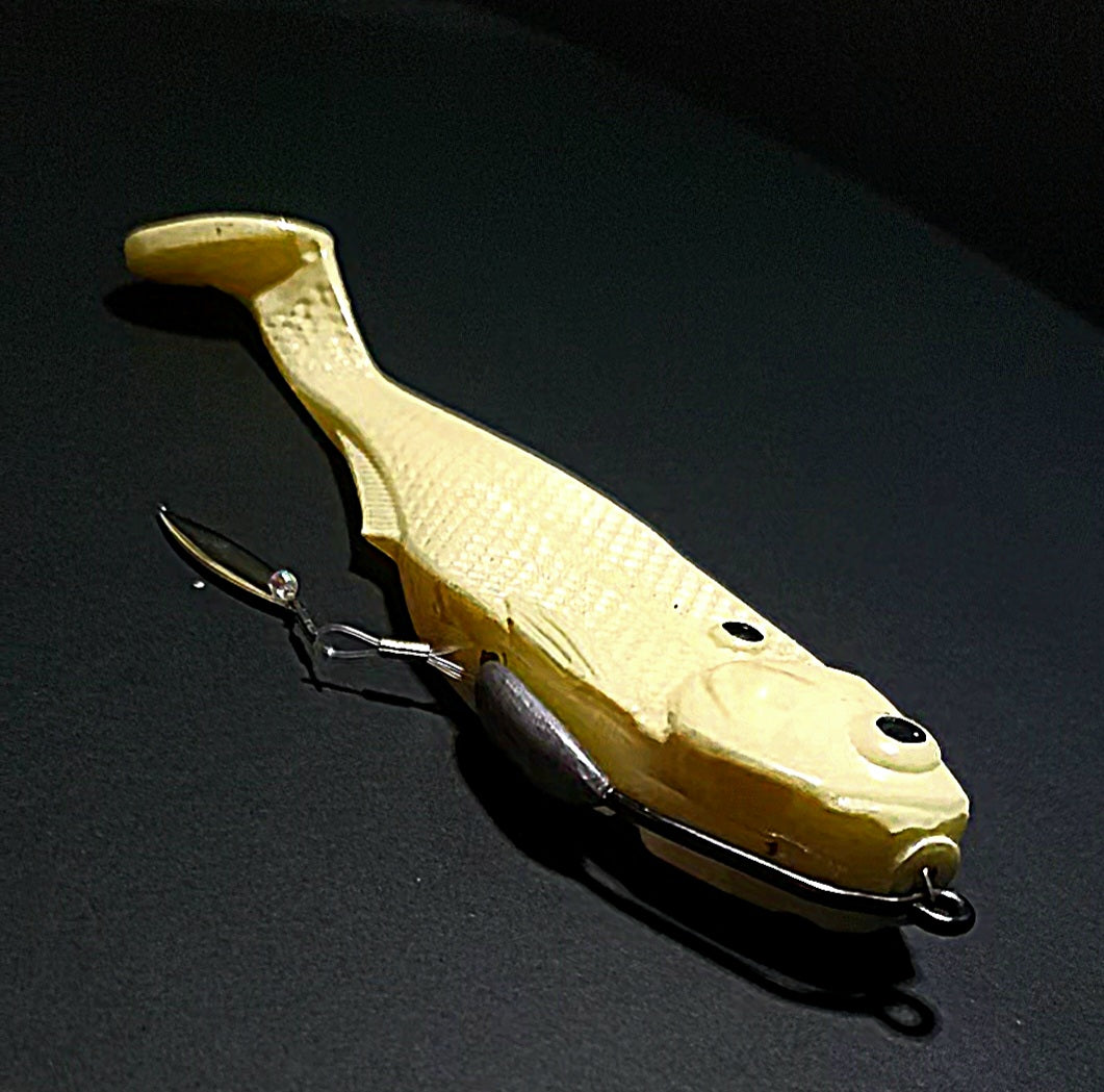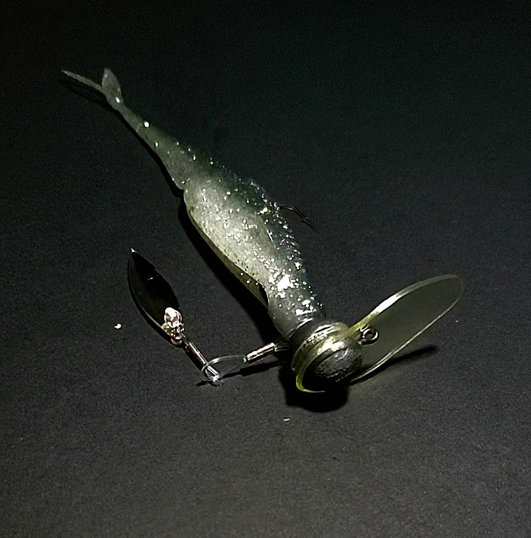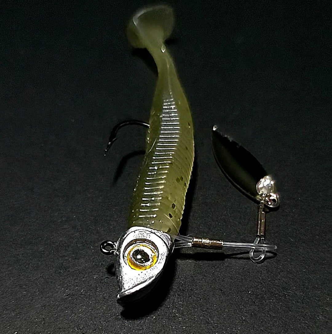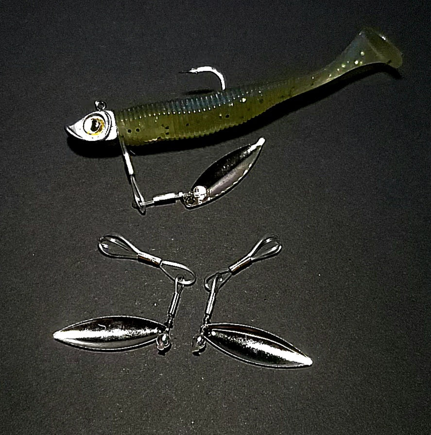 Our clevis-style handmade swivel forces your blade to rotate on a wide track, which translates to a substantially exaggerated body roll as compared to your typical ball bearing swivel based underspin jig. When paired with a jighead and smaller paddle tail swimmer or straight tail plastic, you can expect a body roll that parallels what you'd see with something like a scrounger head, but at most all speeds.