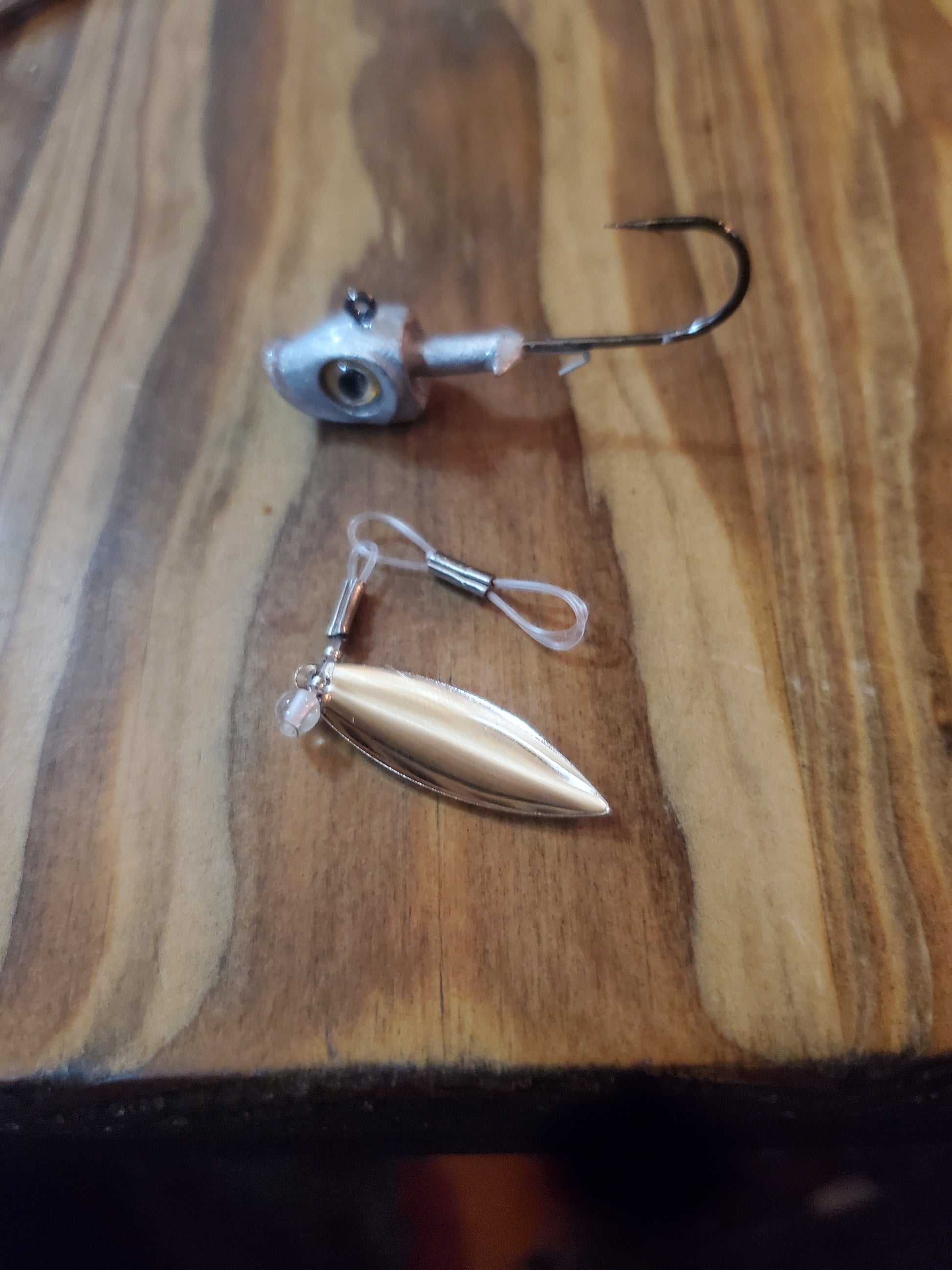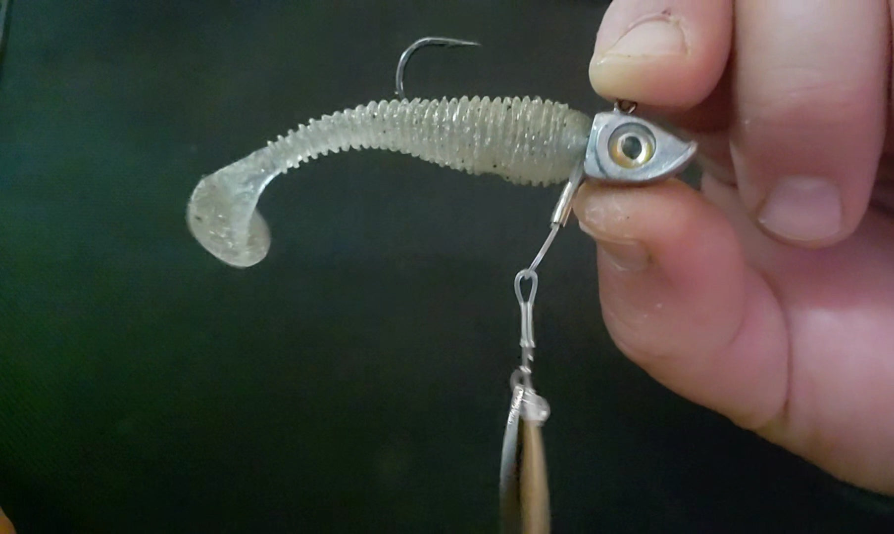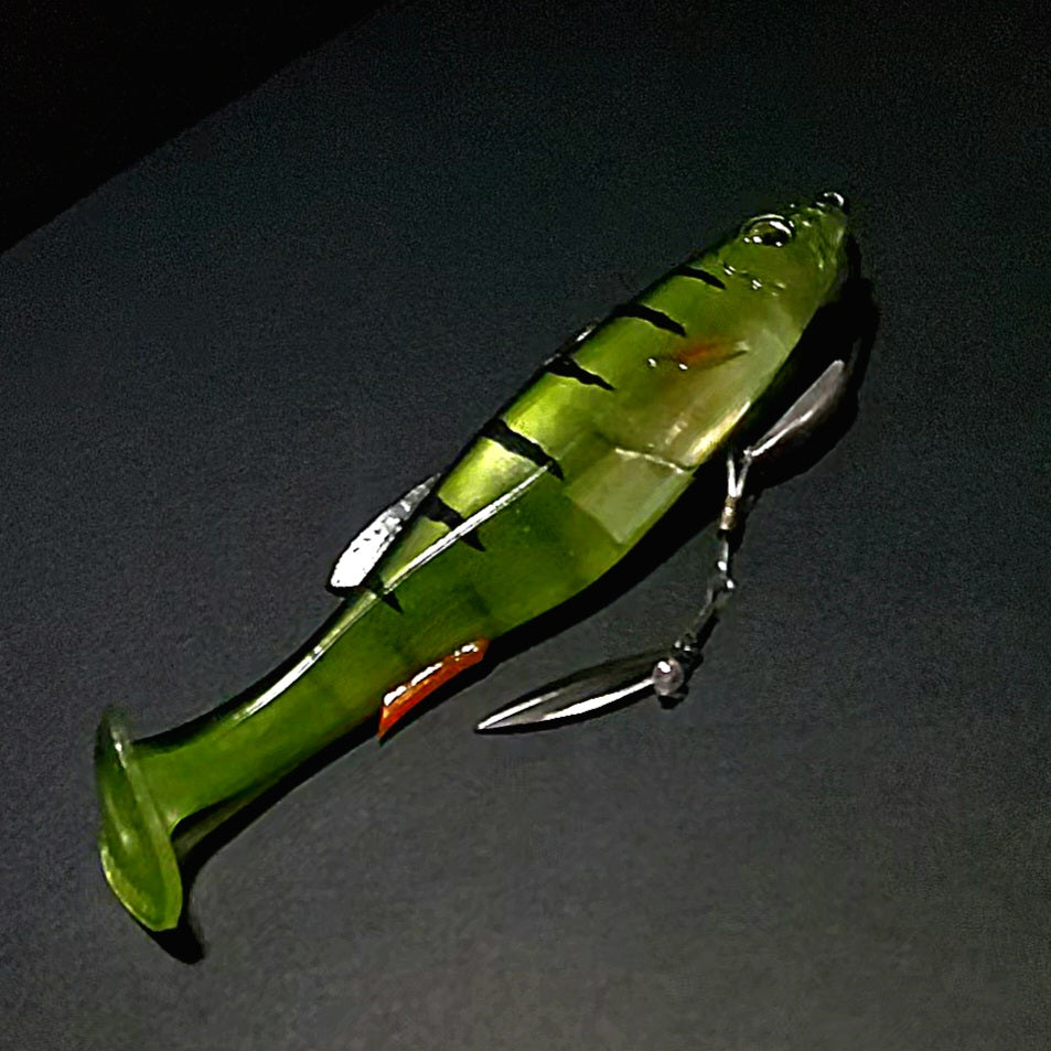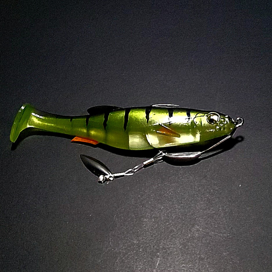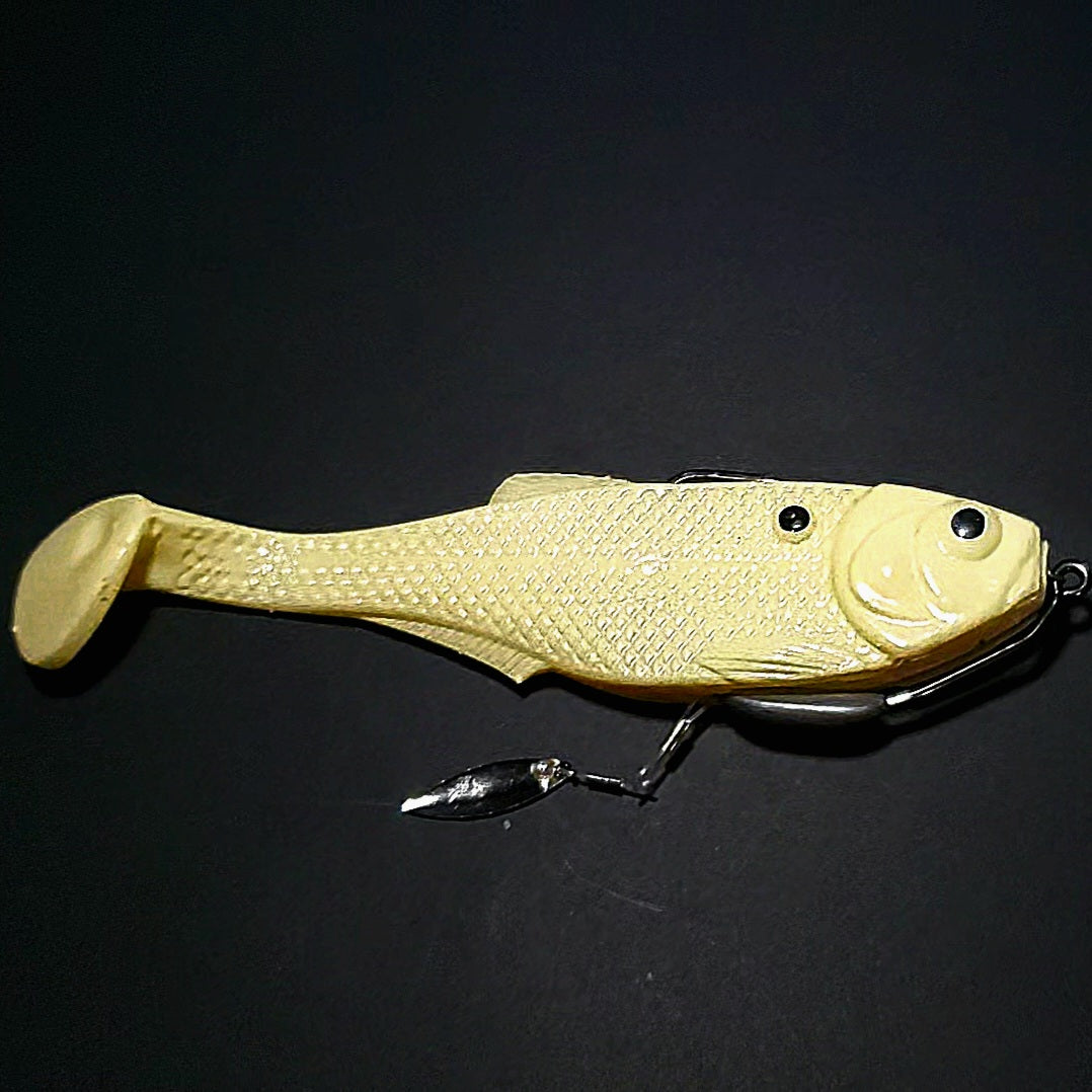 Our clevis-style handmade swivel forces your blade to rotate on a wide track, which translates to a substantially exaggerated body roll as compared to your typical ball bearing swivel based underspin jig. When paired with a jighead and smaller paddle tail swimmer or straight tail plastic, you can expect a body roll that parallels what you'd see with something like a scrounger head, but at most all speeds.