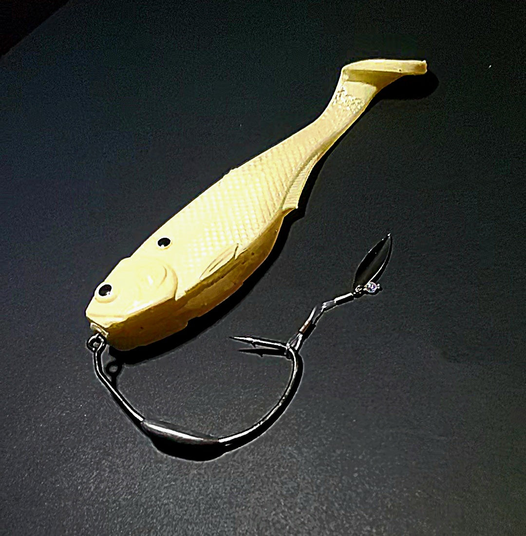 Compatible with any jighead or keel weighted EWG/Screwlock style of hook, you can mount it between the plastic and jighead, or fore or aft the keel weight on your swimbait hook, for added flash, thump and roll, with no need to cut and retie, if your fish are telling you they want something more subtle.